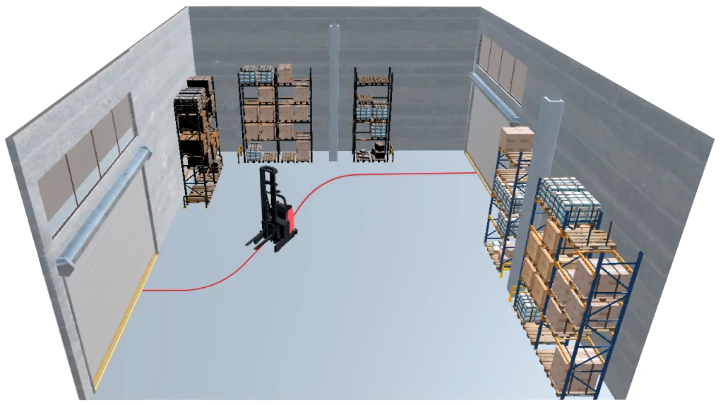 With this type of navigation, a magnetic tape defining the AGV path is placed on the floor, and AGVs equipped with magnetic sensors follow this path. The magnetic tape determines the route, and the AGVs simply follow that route. To be able to make a turn at an intersection, RFID tags indicate the location, and the program inside the AGV determines whether to go left or right. This type of navigation is relatively easy to set up. It is a proven and reliable method; however, it has some severe drawbacks – it only works well with simple paths, and you continuously must maintain the magnetic tape as it gets destroyed very easily, especially by forklift trucks. Another limitation of this system is that you can only drive continuously in the forward direction, i.e., driving backward is not possible. The typical speed of the AGV is 0.8 meters per second only. The flexibility of such a system is limited due to the lack of fleet control and the ability to freely choose a path from location A to B. Traffic management is not possible.