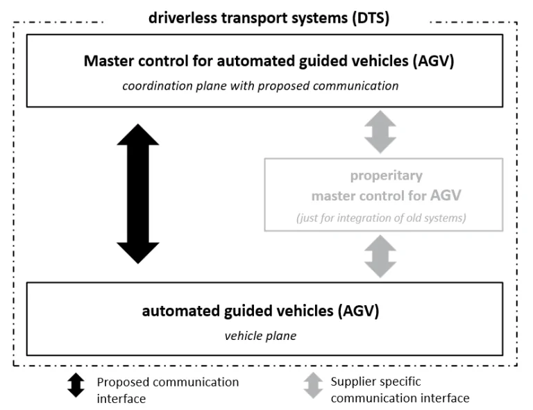 VDA 5050 was defined by VDA (German Association of the Automotive Industry) and VDMA (German Association for Materials Handling and Intralogistics). The main goal of the standard is to create a universally applicable interface for driverless transport systems. VDA 5050 allows managing vehicles with proprietary AGV controls from different vendors directly via a standardized Interface (VDA5050) with a Universal Master Control (fleet control).